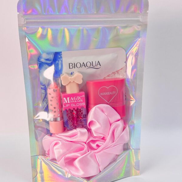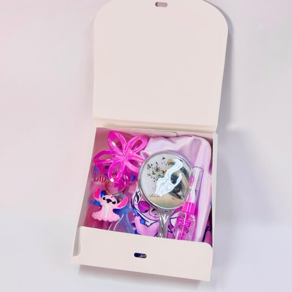 COMBO CAJA NIÑA (GORRO DE SATÍN NIÑA – PESTAÑINA TRANSPARENTE – ESPEJO DE MANO – GANCHO GRANDE – GLOSS LLAVERO)