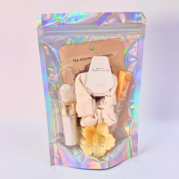 COMBO BOLSA AMARILLO (VELO – POLVO DE HADAS -MOÑA SCRUNCHIE – GANCHO MEDIANO – GLOSS MÁGICO)
