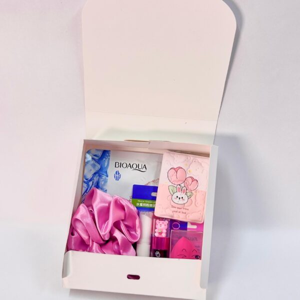 COMBO CAJA ROSADA (VELO – ESPEJO – BALSAMO DE LABIOS – TINTA – MOÑA SCRUNCHIE – BEAUTY BLENDER)