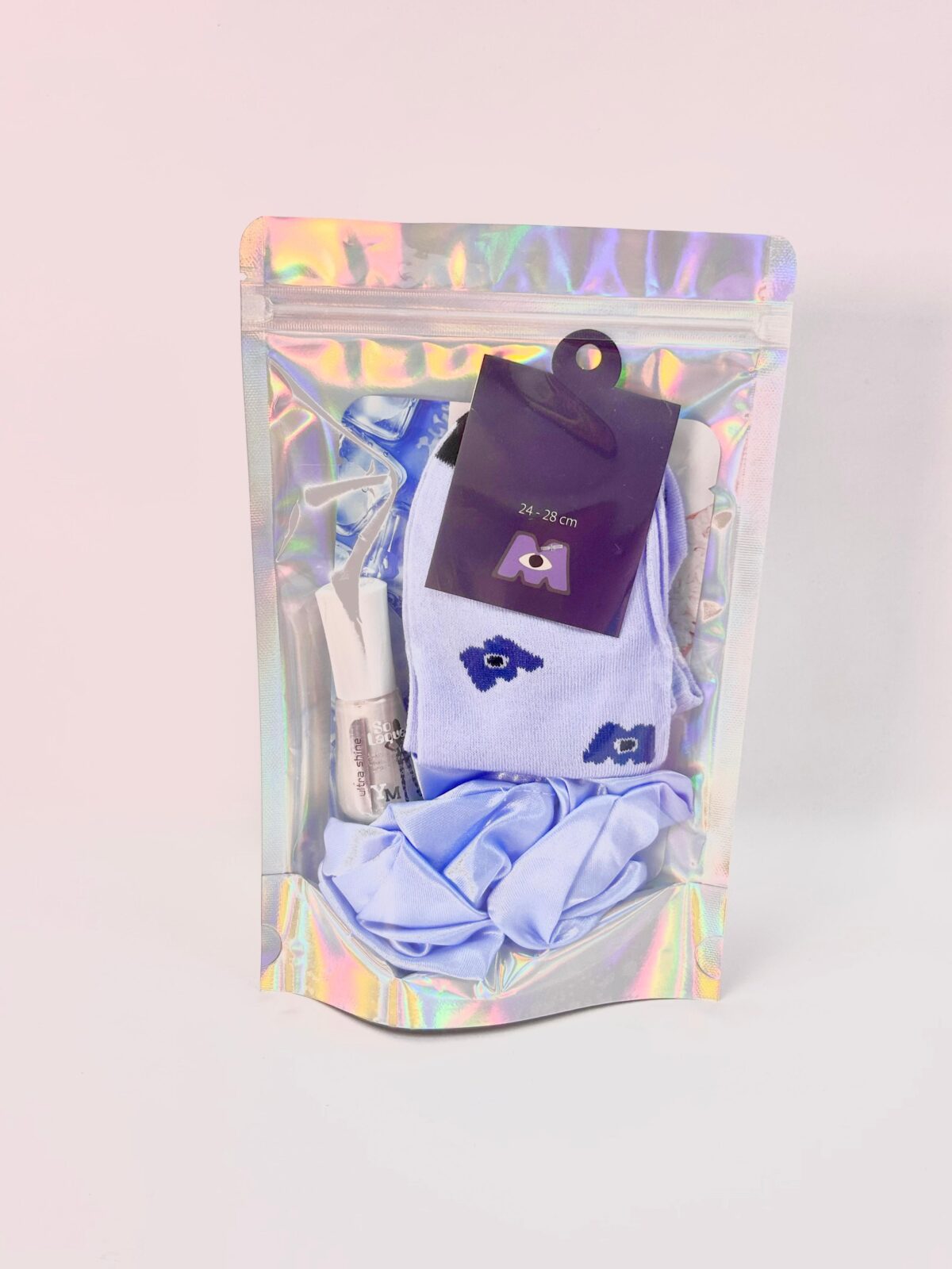 COMBO BOLSA AZUL (VELO – ESMALTE -MOÑA SCRUNCHIE – MEDIAS)