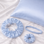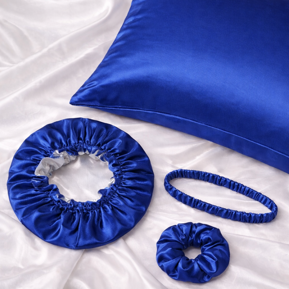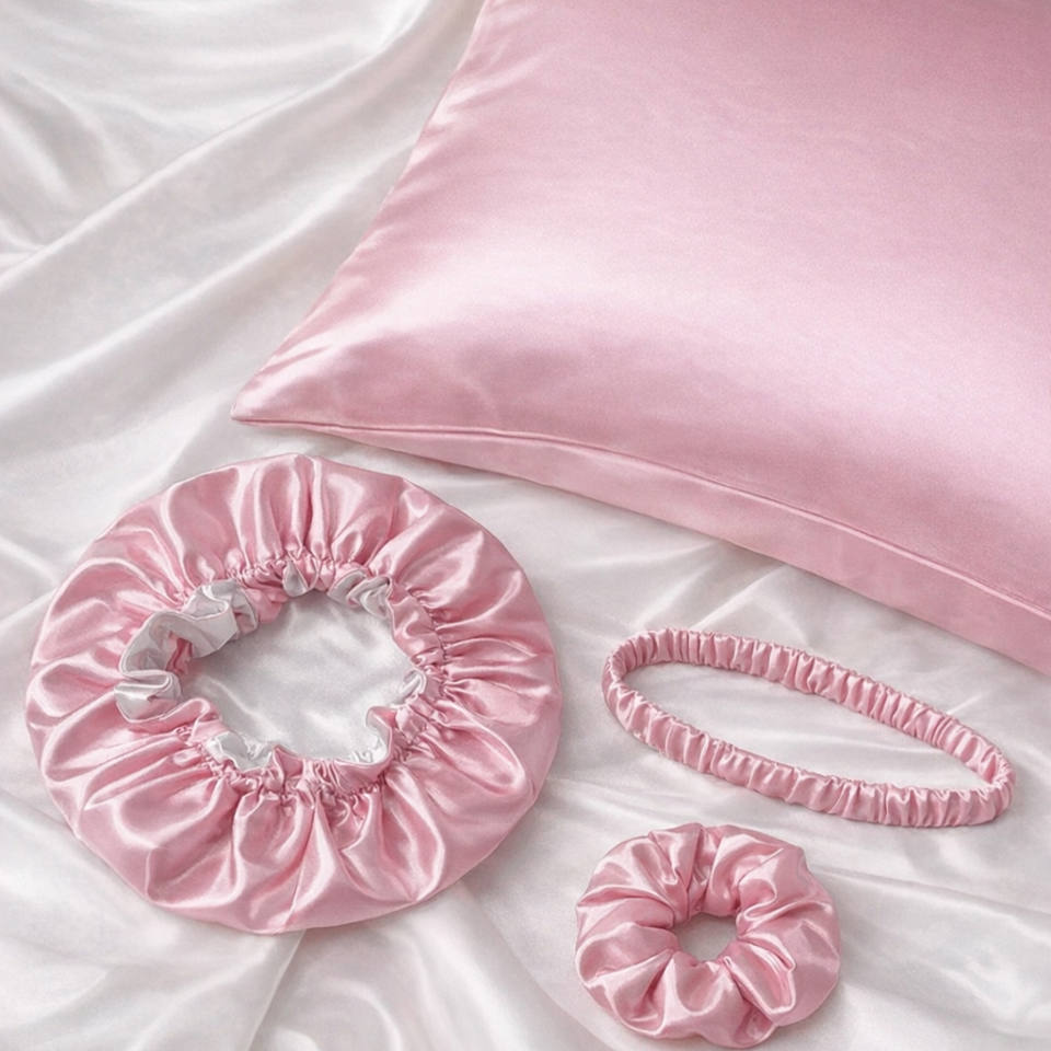 COMBO DE SEDA PARA DORMIR (GORRO SATÍN DOBLE FAZ, FUNDA DE ALMOHADA, BALACA, MOÑA SCRUNCHIE)